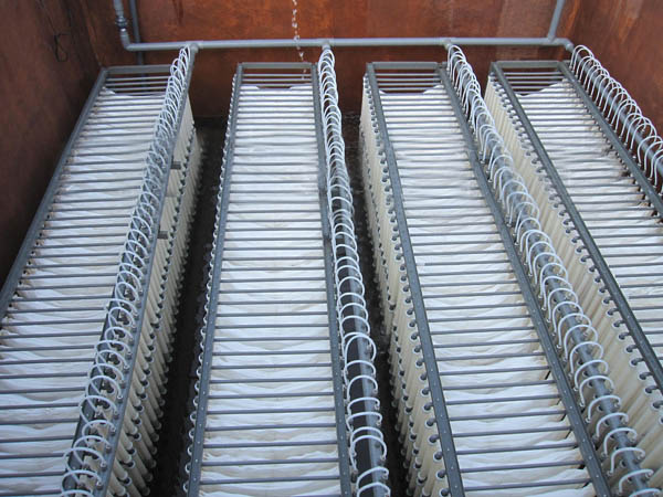 當(dāng)有足夠數(shù)量的有機(jī)營(yíng)養(yǎng)物、礦物鹽和溶解氧時(shí),微生物在填料的表面繁殖,逐步形成畫膜。由于擴(kuò)散作用,氧和營(yíng)養(yǎng)物質(zhì)通過膜供微生物吸收利用。當(dāng)膜長(zhǎng)到一定厚度就會(huì)妨礙這種擴(kuò)散,水中的氧和營(yíng)養(yǎng)物質(zhì)不能通到內(nèi)層,生物膜開始分層,表層是好氧層。面內(nèi)層由于缺氧形成厭氧層。新形成的厭氧層內(nèi),好氧菌死亡溶解,成為兼性厭氧菌和厭氧菌的營(yíng)養(yǎng)。當(dāng)內(nèi)層膜營(yíng)養(yǎng)耗盡,厭氧微生物也大量死亡溶解,于是生物膜內(nèi)層不能支撐表面的生物群體,大塊的生物膜脫落。生物膜脫落而造成的更新面又會(huì)形成新的生物膜。另外少量的生物和一些小塊生物膜,由于水的沖刷或氣泡振動(dòng),不斷離開生物膜進(jìn)人水中,這就是膜的脫落和更新。膜的脫落和更新對(duì)生物膜的活性有積極的作用,可以使生物膜保持穩(wěn)定的生物活性。脫落的膜沉淀后被排出系統(tǒng)。脫落和更新對(duì)水質(zhì)也有一定的影響,增加了水的濁度。